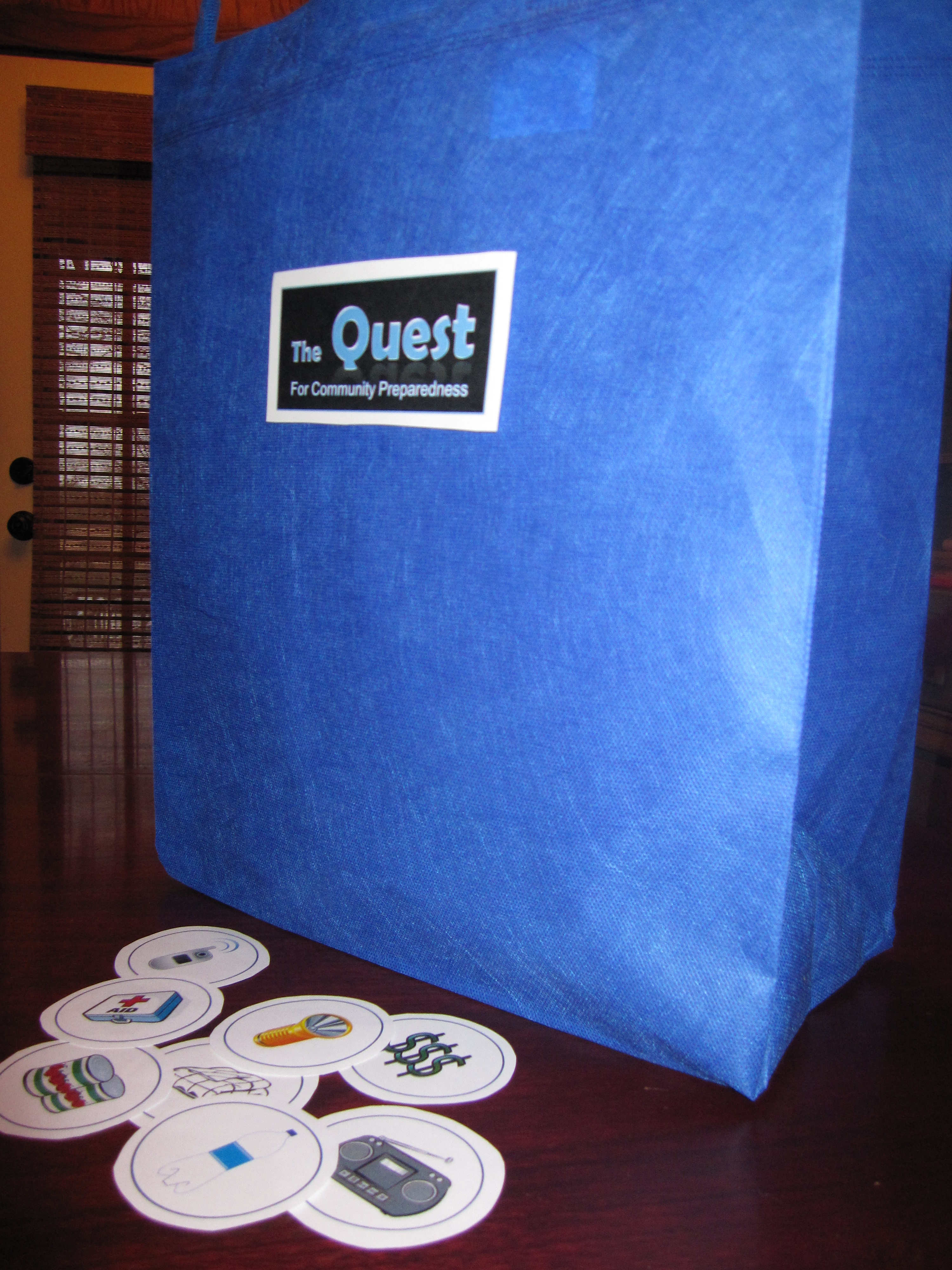 Participants are provided with a screen-printed beginner disaster kit bag with the Quest logo on one side and all participating sponsors on the other (and costs only cents to make). The bag is used to collect pre-distributed kit item discs that represent what you should be including in your very own disaster kit at home and at work. You can find these item discs at the designated sponsoring businesses on the disaster kit bag, and each item will correlate with the business at which you obtain it.