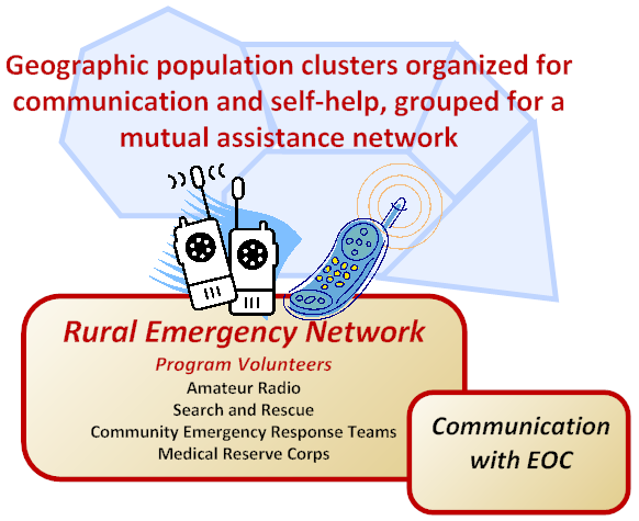 The Rural Emergency Network program creates a method for communication between incident management and residents in outlying areas during an emergency / disaster. This program establishes structured relayed communication that may utilize tools such as phones or two-way radios.